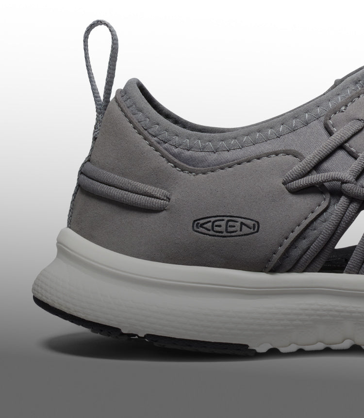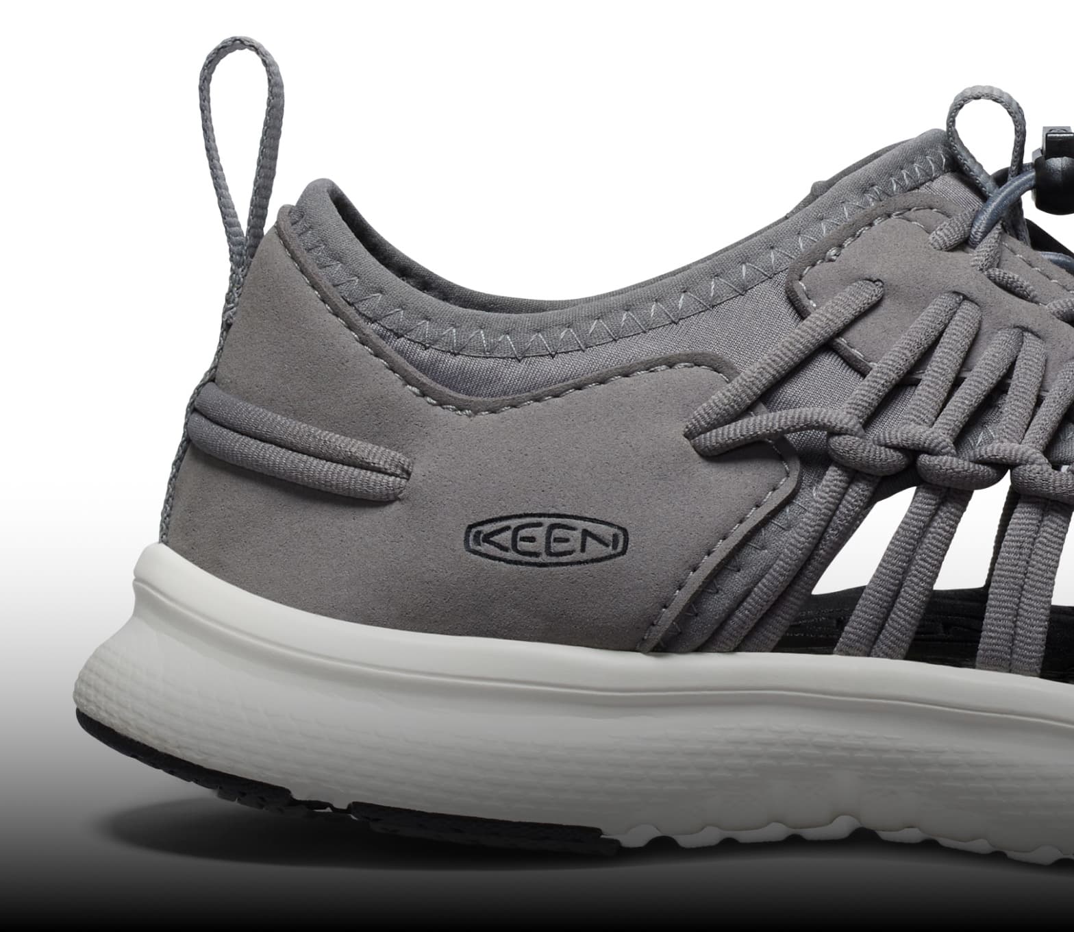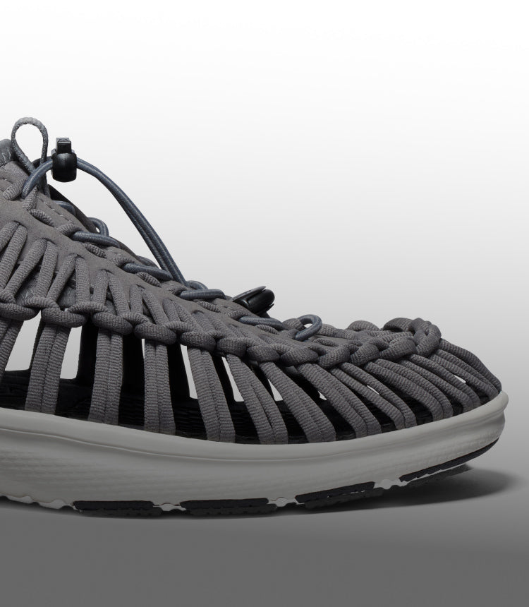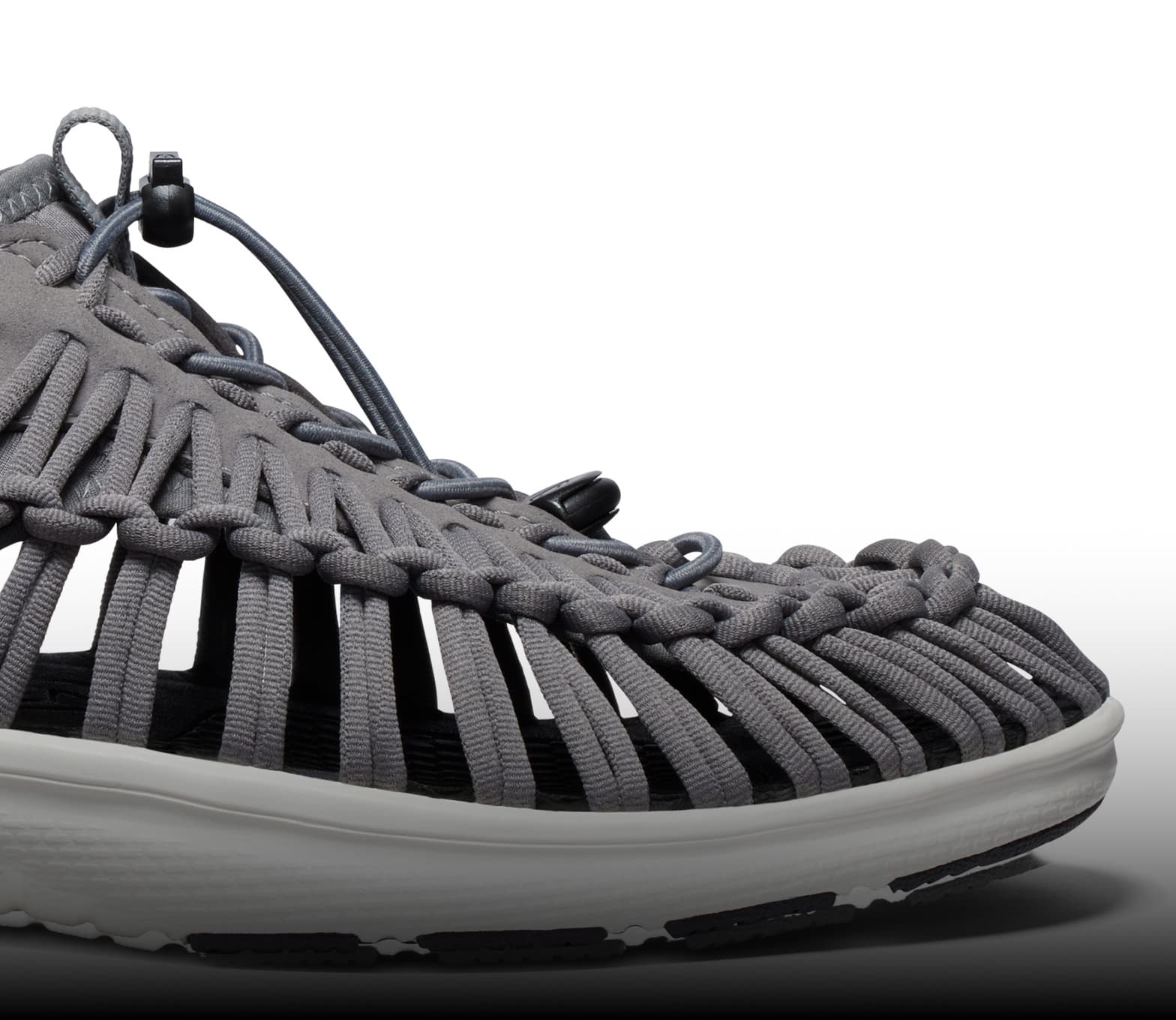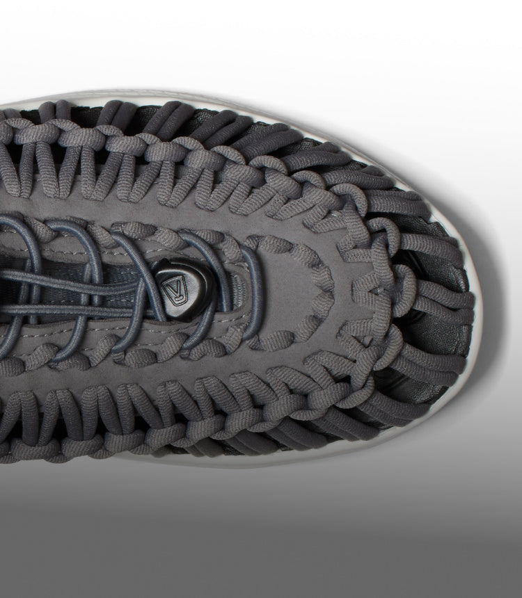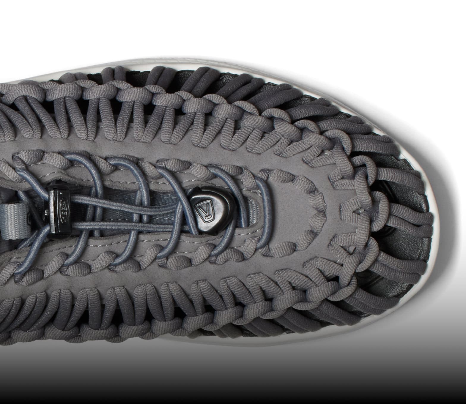 Unsere innovatives 2-Schnüre-Design aus 100% recyceltem P.E.T.-Kunststoff. - Universell verstellbare Passform, die sich Deinem Fuß perfekt anschmiegt.